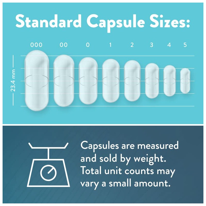 • SIZE 00 CAPSULE: PureCaps fillable capsules for powder can be filled with up to 950 mg of powder, depending on density. Typical fill weight is approximately 665 mg using a density of .70. NOTE: Not for liquids