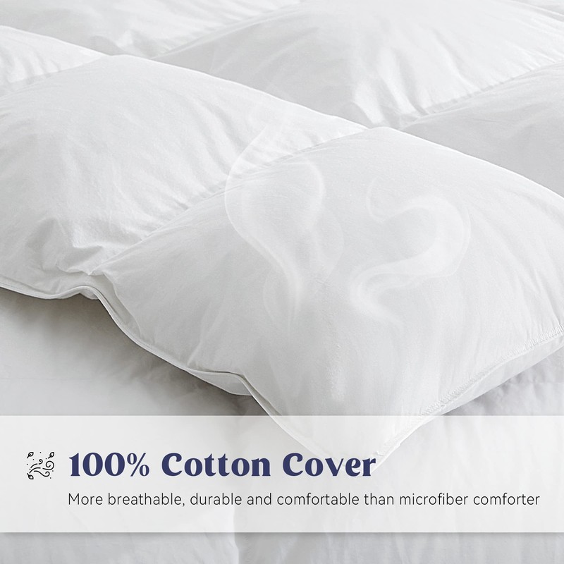 - 【Ultra-Soft Fabric】- These goose down feather comforters are magnificently soft, smooth, and pleasantly weighty, the shell is made from 100% cotton, makes it much softer and more comfortable on the skin. The comforters are noiseless, creating almost no rustling sounds even as you toss and turn on your bed. They're down-proof so there won't be any annoying filling poking at you and disturbing your slumber.