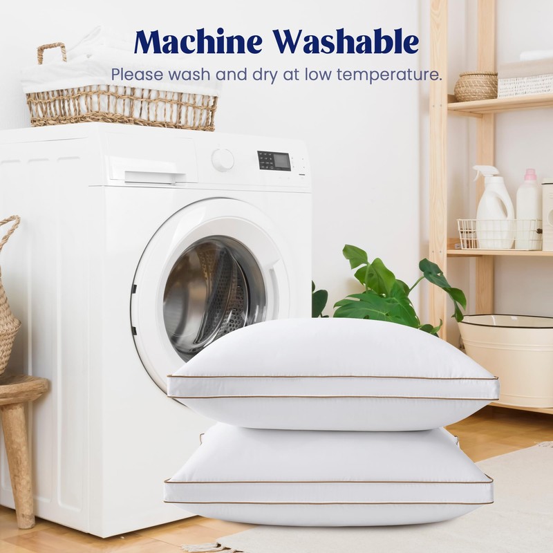 - Easy Care: These fluffy bed pillows are are machine washable and can be tumble dried on low for easy maintenance and washed directly in your home washer and dryer. Even after repeated washings they will bloom with new luster. Sturdy stitching adds to its durability and prevents filling from leaking out.