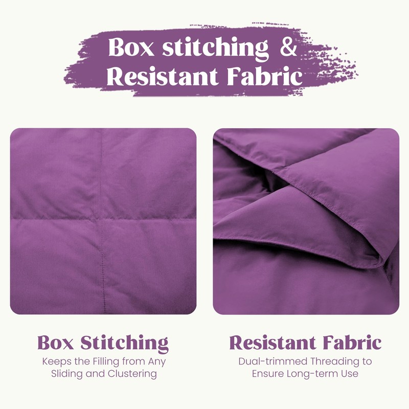 - Unique Design: Unlike other blankets, the unique box-stitched keeps the filling from any sliding, clustering, and ensures the down filling spread over the entire surface of the throw which makes the level of warmth and coziness is the same