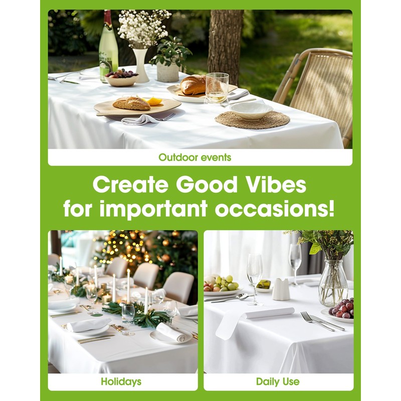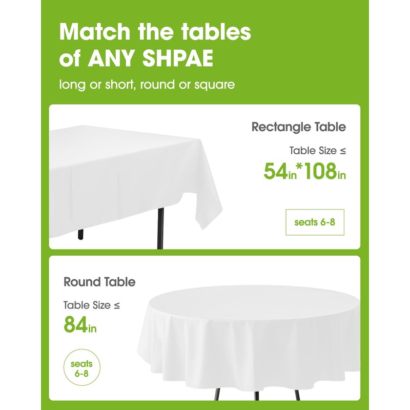 1. Pureegg disposable white tablecloths come in dimensions of 54in x 108in, accommodating various table shapes and sizes, including rectangular tables up to 4.5ft x 8.9ft and round tables up to 7ft.