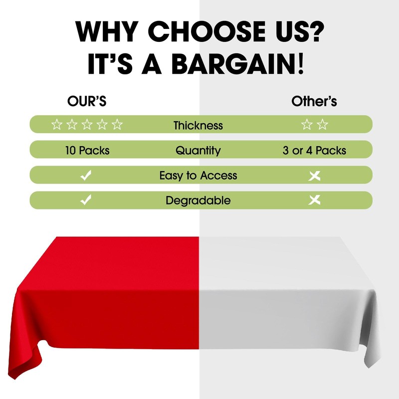 - BUDGET FRIENDLY OPTION: Our disposable table cloths for parties come in a variety of vivid colors to choose from. Whether for indoor/outdoor dining, decorating, or daily use, our 10-pack is a cost-effective option.