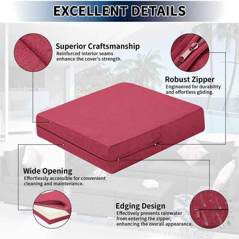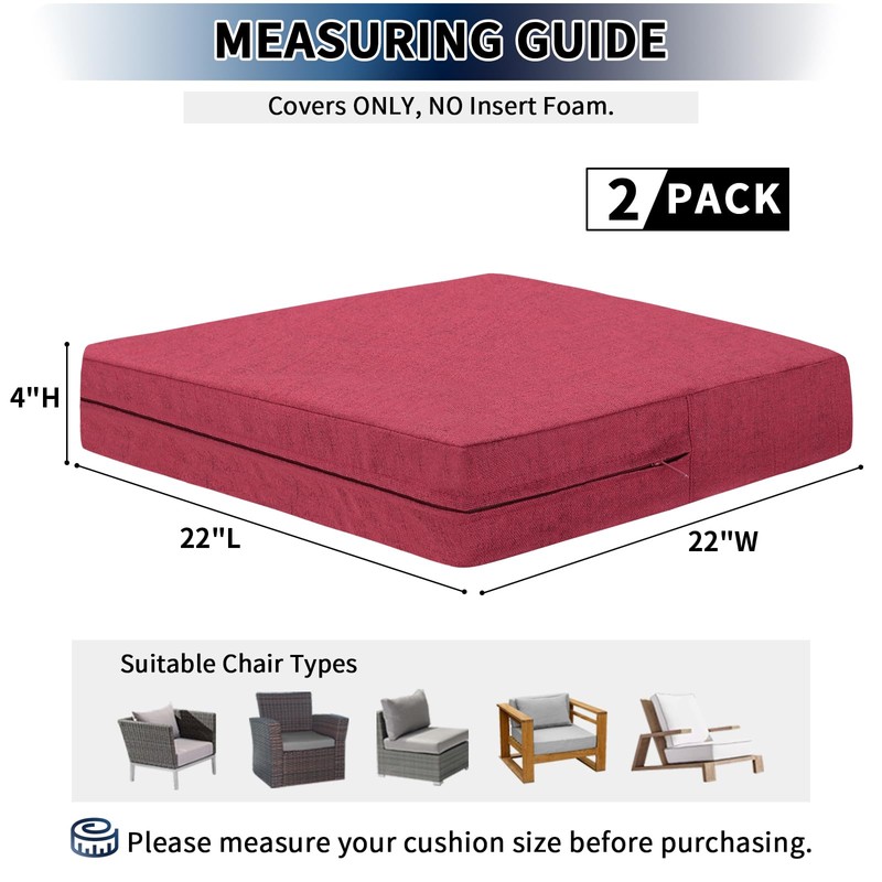 - Replacement Patio Cushion Covers: 2 pack outdoor cushion covers, measuring 22"L x 22"W x 4"H, boast a sophisticated linen-like texture, adding a touch of elegance to your outdoor seating area. COVER ONLY - NO CUSHION INSERTS. Please measure your cushion size before purchasing.