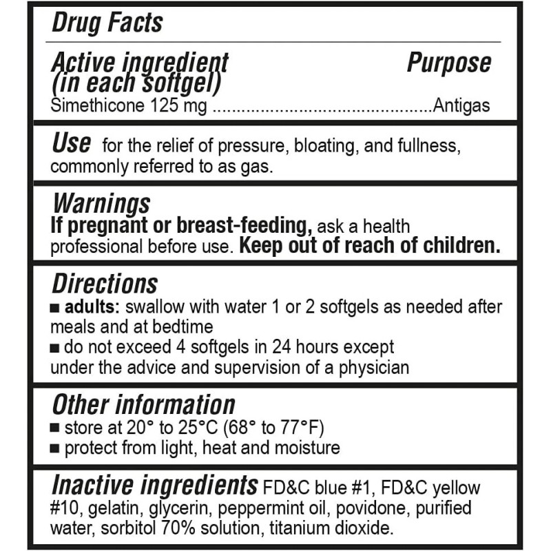 - ☑️ Directions: Adults and children 12 years of age and older may take one or two simethicone gas relief softgels as needed, not to exceed two softgels in 24 hours.