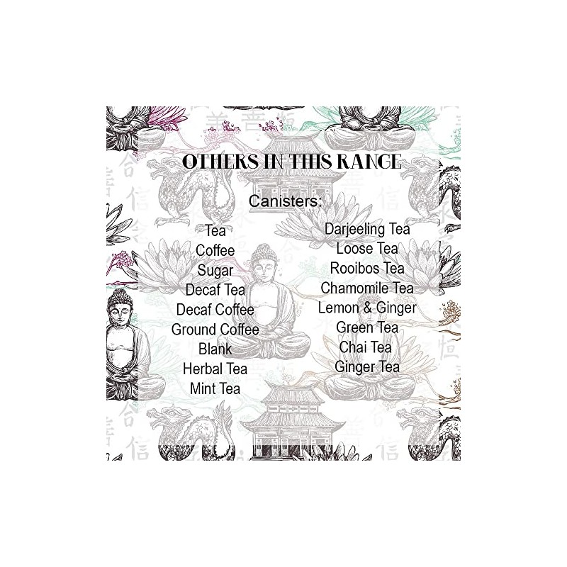 • This sturdy enamel lemon & ginger tea storage container is a stunning yet practical addition to any kitchen! Featuring an Asian-inspired print, with Buddhas, dragons, buildings & cherry blossom.