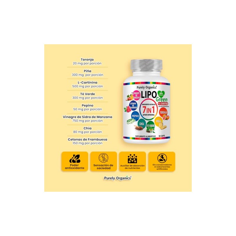 Purely Organics - Purely Organics | LipoGreen 7 en 1 | Vinagre de Manzana, L-Carnitina y Extractos Naturales | 90 Cápsulas. 🏆 Reconocido por su excelente relación calidad-precio. Diseño ergonómico y funcionalidad excepcional. 🔥 Alta demanda - Stock limitado. Ideal para quienes buscan lo mejor en calidad y estilo. Producto auténtico con satisfacción total asegurada. ¡No te quedes sin el tuyo y aprovecha esta oportunidad única!