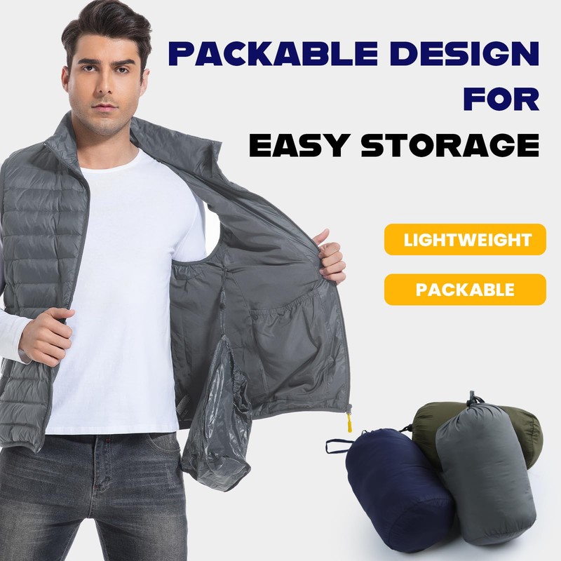 - PACKABLE DOWN VEST: The lightweight packable puffer vest has an inside organizer pocket that fits easily into a backpack, making it especially suitable for long trips or outdoor activities that require a light pack