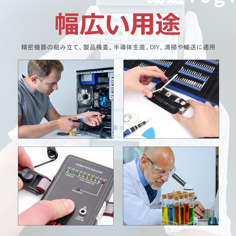 - 【幅広い用途】この静電気防止手袋は精密機器の組み立て作業、製品の検査作業、半導体工場の部品のライン生産、印刷、園芸、DIY、清掃などさまざまな作業や、電子製品の包装と輸送にも適用しています。