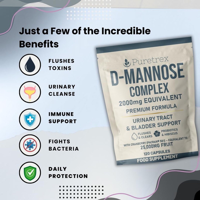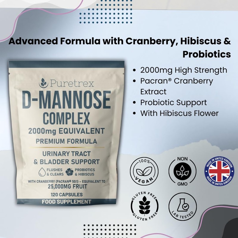 Puretrex D-Mannose Complex, 2000mg, Urinary Tract Support, 120 Capsules with Cranberry, Probiotics and Hibiscus