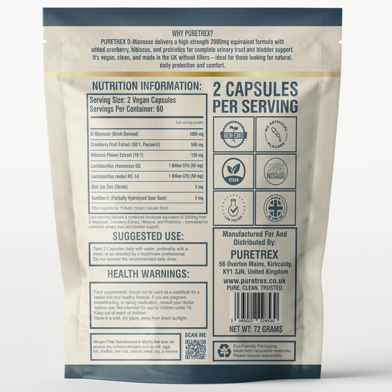 PURETREX D-Mannose Complex is a premium vegan supplement designed to support urinary tract and bladder health using a powerful blend of D-Mannose, Cranberry Extract (Pacran), Hibiscus, Probiotics, and Zinc. Each serving delivers a high-strength 2000mg equivalent formula, carefully crafted for natural flushing, daily balance, and protection. Formulated with clean, lab-tested ingredients and no fillers, this UK-made formula offers a complete solution for those looking for comfort, freshness, and confidence. The advanced combination helps flush out unwanted bacteria, balance microbiota, and soothe the bladder – making it ideal for women and men who want daily support the natural way. Whether you’re prone to UTIs, want a daily cleanse, or just care about your intimate wellness, PURETREX has you covered. Packed in eco-friendly pouches and made with plant-based capsules, this is supplement care done right.