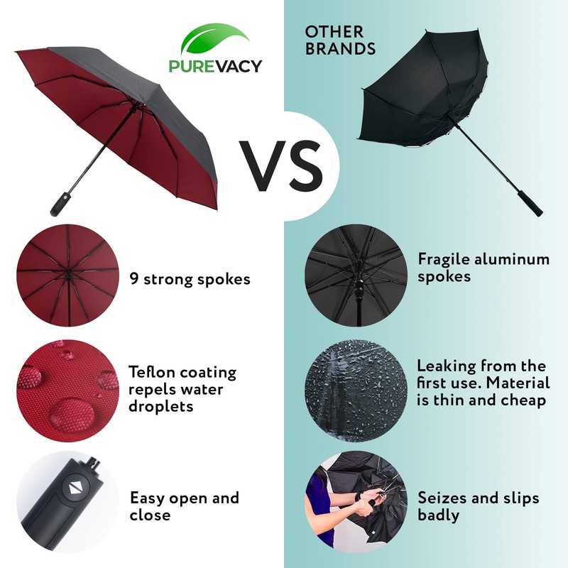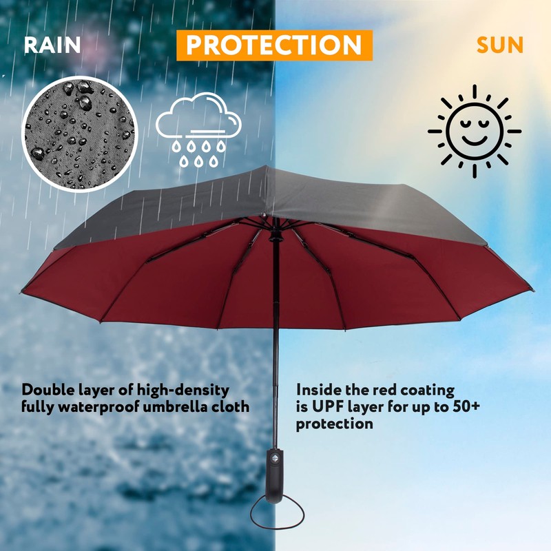 - Red-Black Automatic Umbrella 11.5 inch: Strong umbrella for wind and rain is safeguard against rain, snow, and sun rays. With waterproof Teflon coating & reliable fiberglass spokes, umbrella for men, women is efficient and trustworthy option for wind and rain.