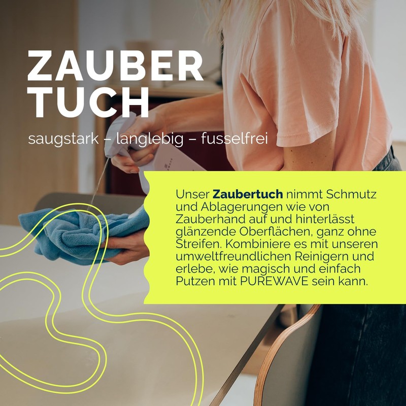 The Purewave magic cloth is your indispensable helper for streak-free cleaning. This high-quality microfibre cloth is perfect for windows, mirrors, glass surfaces and other surfaces that need to be radiantly clean. Thanks to its ultra-absorbent microfibres, it effortlessly removes dust, dirt and fingerprints without leaving residue or lint - without the use of detergents. The magic cloth is machine washable and reusable, making it a sustainable choice for cleaning. Made in Germany, it stands for the highest quality and durability. Whether in the home, car or office – the Purewave magic cloth delivers perfect results at all times and protects the environment. Trust in the power of microfibers for easy, effective and environmentally friendly cleaning.