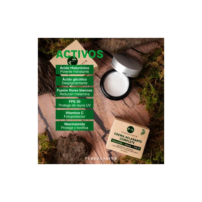 PIEL SIN MANCHAS Y LUMINOSA: La Crema aclarante complete te ayuda a reducir los daños causados por el sol, la edad y la deshidratación, devolviéndole a la piel su brillo y tono natural, dejando las áreas faciales, corporales y manos libes de manchas e imperfecciones. Además de ser hidratante y proteger de los rayos solares. Gracias a su alto contenido de activos como el ácido hialurónico, la niacinamida, el ácido glicólico y FPS 30.