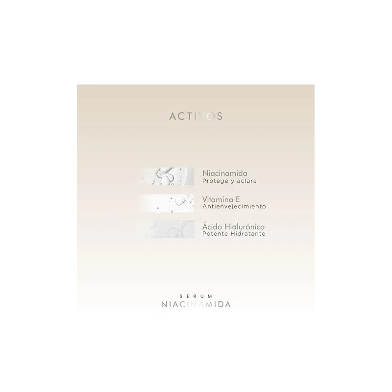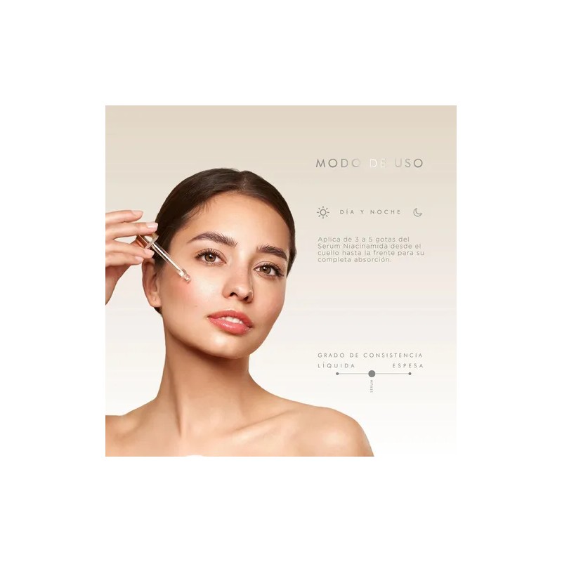 CONTENIDO: Este suero de niacinamida incluye vitamina B3, ácido hialurónico y vitamina E, poderosos hidratantes y antioxidantes que devuelven la forma y firmeza a la piel y ojos en las áreas afectadas por pecas, ojeras, líneas de expresión, bolsas.