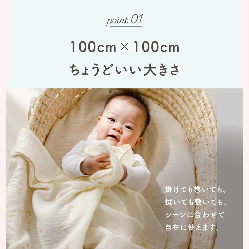 100% cotton gauze, baby friendly natural swaddle. Double layered gauze hugs child's skin 39.4 x 39.4 inches (100 x 100 cm) in size that is comfortable It is very compact when folded, and it is excellent for storing in your luggage or bag. The cotton is gentle on the skin and has excellent water absorption and quick drying for easy washing. Great for all seasons. The large size makes it perfect for newborn babies, or even when they grow up like a towel or blanket. The carefully designed design is printed with a cute motif in light color, making it a great gift for a discharge or baby shower.