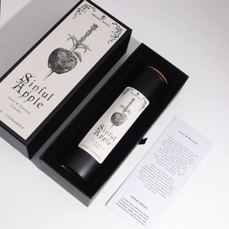 - Mystical and elegant design, inspired by seduction and love. Packed in a box with a symbolic design that emphasizes the apple as an element of seduction, these black candles are ideal for those looking for authentic esoteric tools. The unique presentation makes it a perfect gift for lovers of magic, spirituality and wishes.