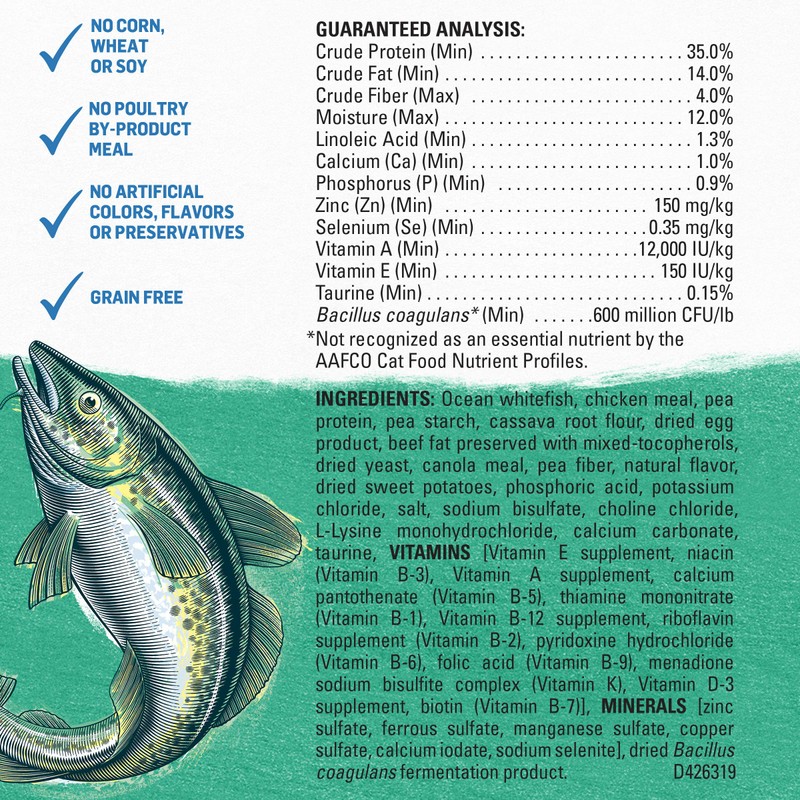 - High protein dry cat food with real wild-caught whitefish as the number 1 ingredient and natural probiotics for digestive health
