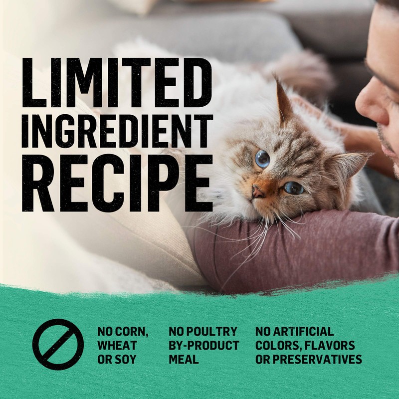 - Simple ingredient, gluten and grain free dry cat food with no corn, wheat, soy, poultry by-product meal, or artificial colors, flavors or preservatives