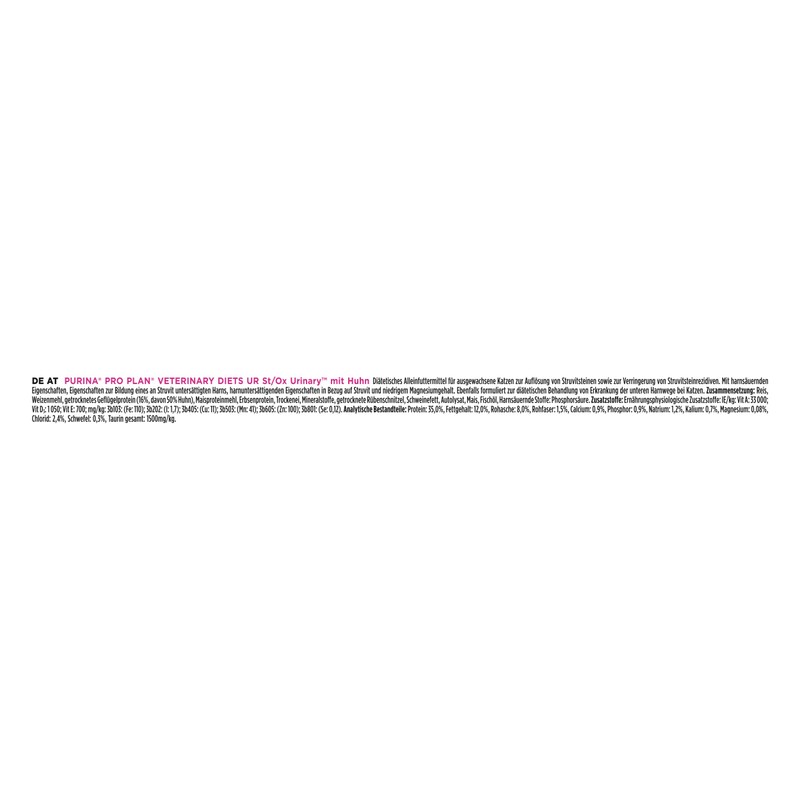 Complete diet feed for adult cats to dissolve struvite stones and reduce struvite stone recurrences. With uric acid properties and low magnesium content. Suitable for dietary treatment of cats with lower urinary tract diseases (FLUTD). Urinary tract infections and struvite stone formation can be very painful for cats, leading to urinary bladder inflammation and bleeding. Proper dietary pet food can help your cat avoid surgical struvite stone removal. Urinary stones are the result of combinations of various underlying risk factors, many of which cannot be controlled: age, race, gender, genetic factors and microorganisms. Helping your cat can be difficult, but proper nutrition can promote the dissolution of struvite stones and crystals and prevent calcium oxalate formation. PURINA PRO PLAN UR St/Ox URINARY contains a special nutrient blend that promotes a urine pH of 6.0, and contains a low but high-quality amount of protein.