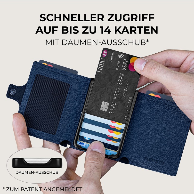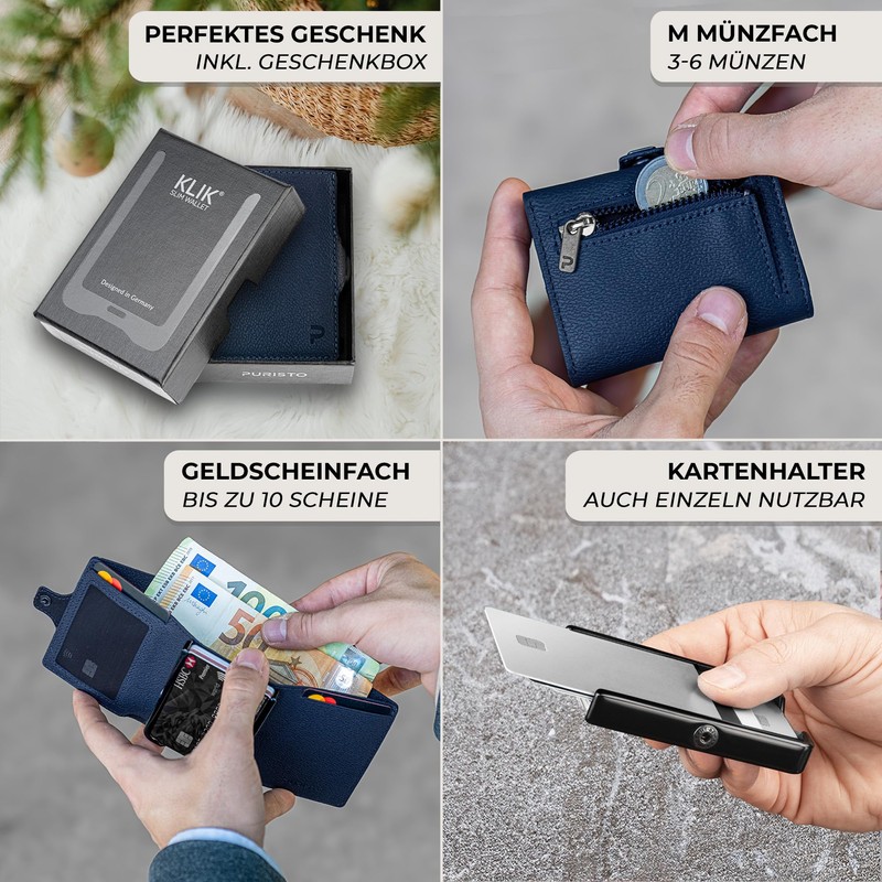 PURISTO KLIK Slim Wallet with Coin Compartment Men's - Leather Money Clip Mini Wallet Men's Small with Coin Compartment, RFID Blocker - Leather Card Case, darkblue, M coin compartment - 14 cards