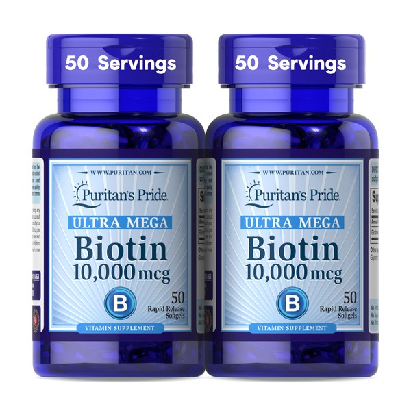 Puritan's Pride Premium Ultra Mega Biotin 10,000mcg, Dietary Supplement for Healthy Hair, Skin, Nails, and Energy Metabolism Support, 100 Day Supply, 50 Rapid Release Softgels, 2 Pack