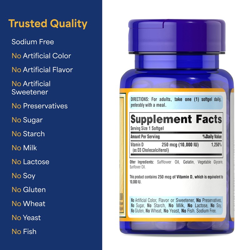 Puritan's Pride Premium Sunvite™ Mega-Potency Vitamin D3 10,000 IU, Dietary Supplement for Healthy Bones, Teeth, and Immune System Support, 100 Rapid Release Softgels