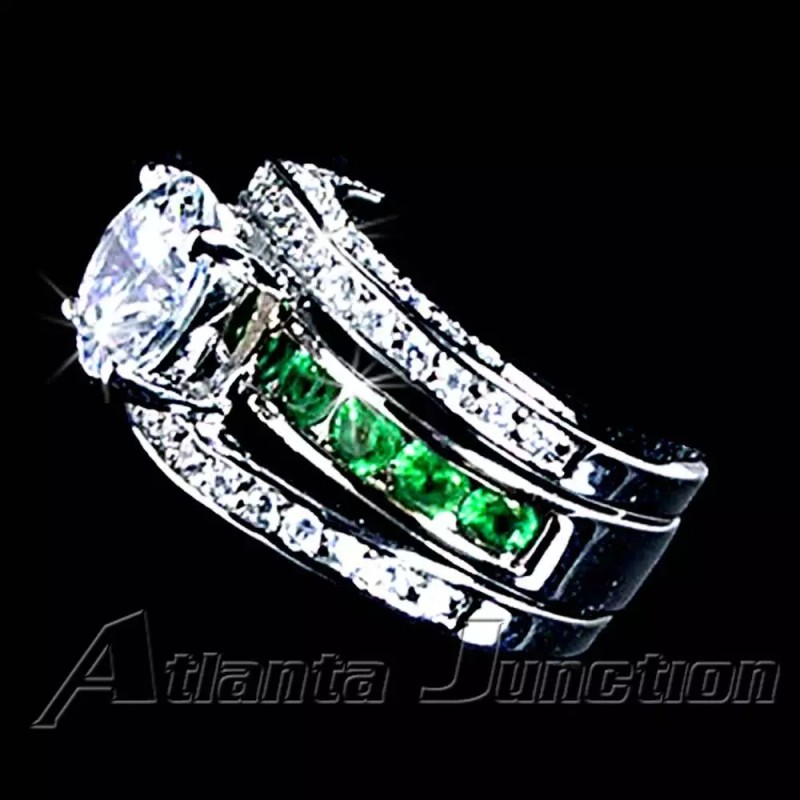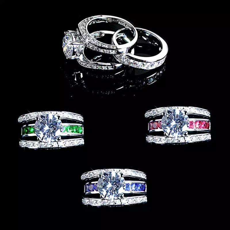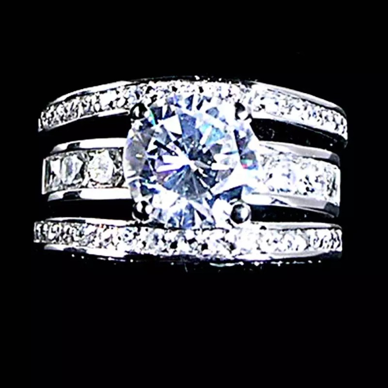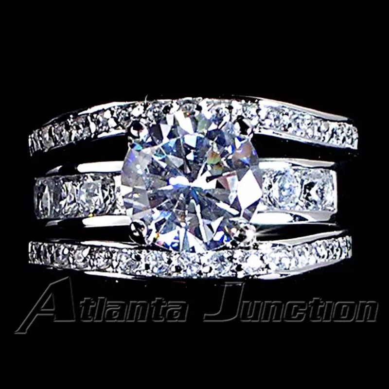 2 Ring set... a REAL STUNNER --- Brilliant CZ Ring Jacket / ring guard holds a band of channel set CZ band ring....Absolutely GORGEOUS! Ring Jacket cradles a 2.5 carat brilliant cut CZ. Pave' CZ's go half way down the shank of both bands and also on the front and back sides of the gallery and shank of the ring guard. Center Band ring insert can be worn separately. It holds 3mm channel-set brilliant CZ's. NOTE: We also have ruby red - green emerald and blue sapphire center band inserts that are interchangeable. Looks so good it's impossible to distinguish between these and real ones costing thousands of dollars. |