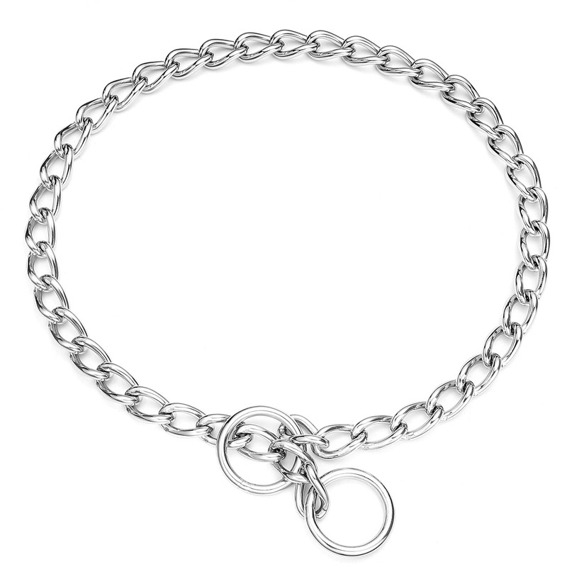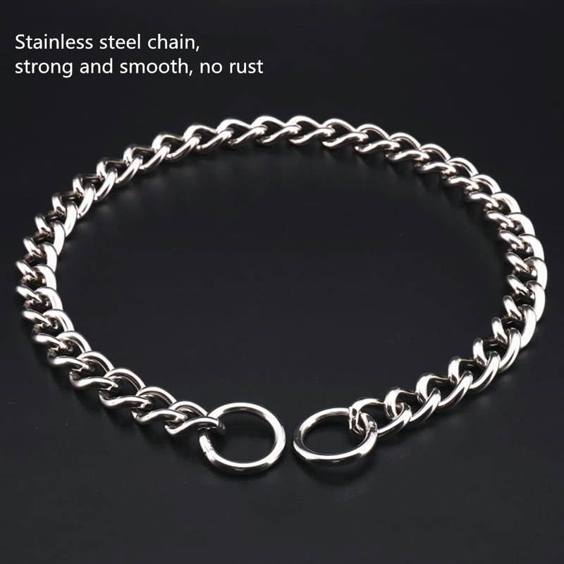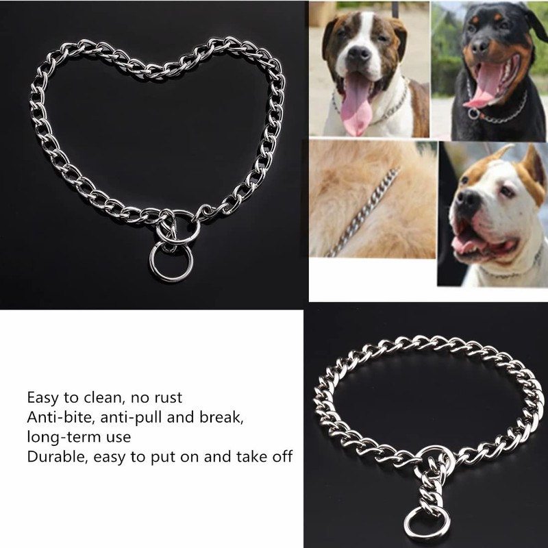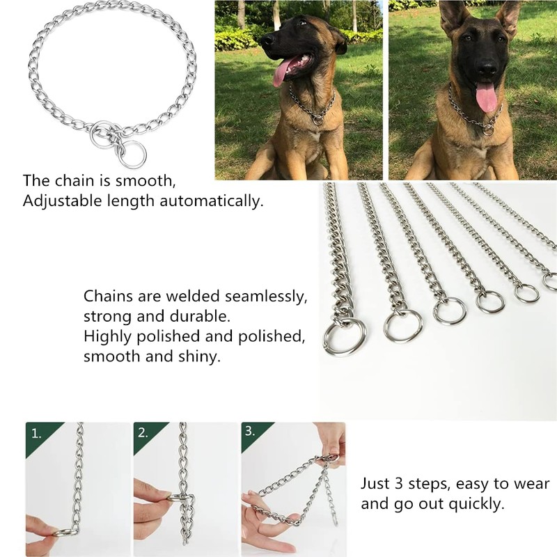 - Stainless steel chain collars: The stainless steel chain has a smooth surface, non-irritating, and will not harm the dog's skin or fur.The collar is waterproof, won't rust, sturdy and chewy, hard to damage.Suitable for dog walking training.