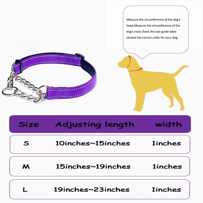 - Size for Martingale Chain Dog Collars:The collar is available in three sizes, small, medium and large, suitable for large medium dogs and small dogs, with necks ranging from 10 inches to 24 inches, and the collar is adjustable in length. S-(dog's neck10 -15inches), M-(dog's neck15-19inches), L-(dog's neck19-23inches).