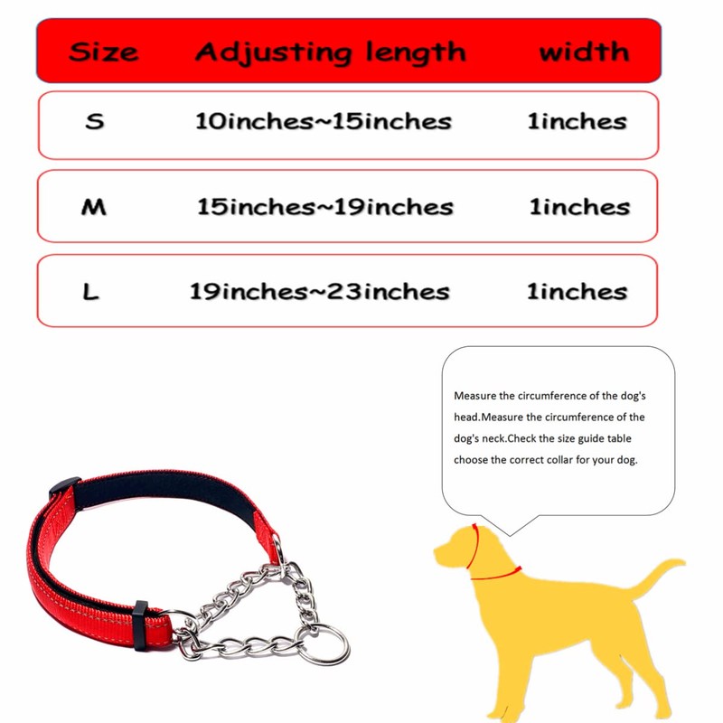 - Size for Martingale Chain Dog Collars:The collar is available in three sizes, small, medium and large, suitable for large medium dogs and small dogs, with necks ranging from 10 inches to 24 inches, and the collar is adjustable in length. S-(dog's neck10 -15inches), M-(dog's neck15-19inches), L-(dog's neck19-23inches).