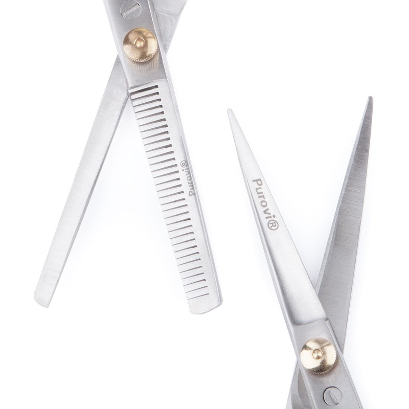 - Box contents: Purovi set of 2 scissors consisting of 1 x classic hair scissors and 1 x thinning scissors (double-sided teeth). Professional quality stainless steel hair scissors, with ergonomic shape, black rubberised finger rings, finger hooks for finger rest and adjusting screw. Includes 1 x case for safe storage. The openings of the finger rings can be enlarged if necessary.