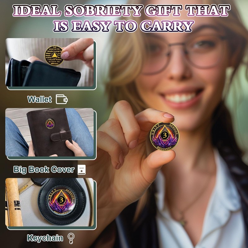 Purple Flame 3 Year Sobriety Coin Three Year Sobriety Coins AA Chips and Medallion Serenity Prayer Coin Recovery Anniversary Token Sobriety Gifts for Men Women Alcoholics Anonymous Gift