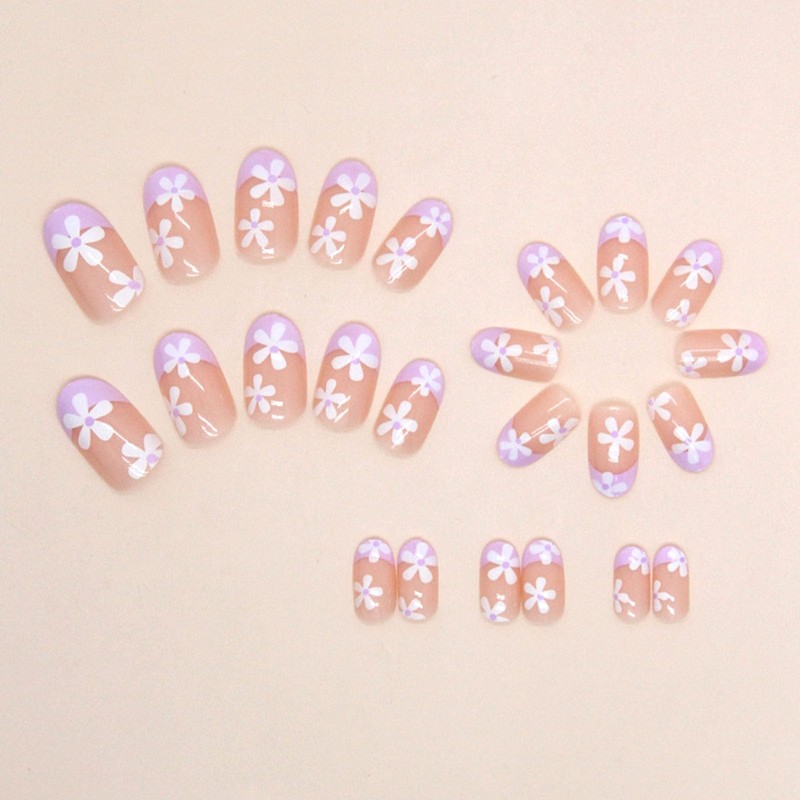 Purple French Tip Press on Nails Short Oval Fake Nails with White Flower Design Glue on Nails Nude Full Cover Nails Press ons Glossy False Nails Artificial Stick on Nails for Women 24Pcs