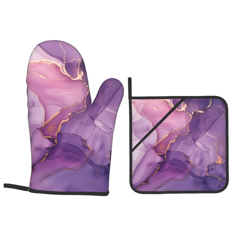 Purple Gold Marble Oven Mitts Pot Holders Set of 4, Kitchen Gloves Potholders Heat Resistant for Chef Baking Cooking Grilling BBQ