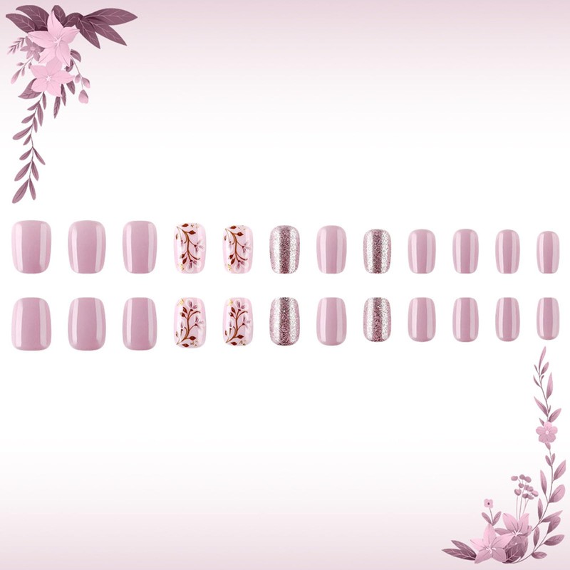 Purple Press on Nails Short Fake Nails with Floral Glitter Designs Spring Summer Nails Press ons Glossy Glue on Nails Square Acrylic Nails Cute False Nails Artificial Stick on Nails for Women 24Pcs