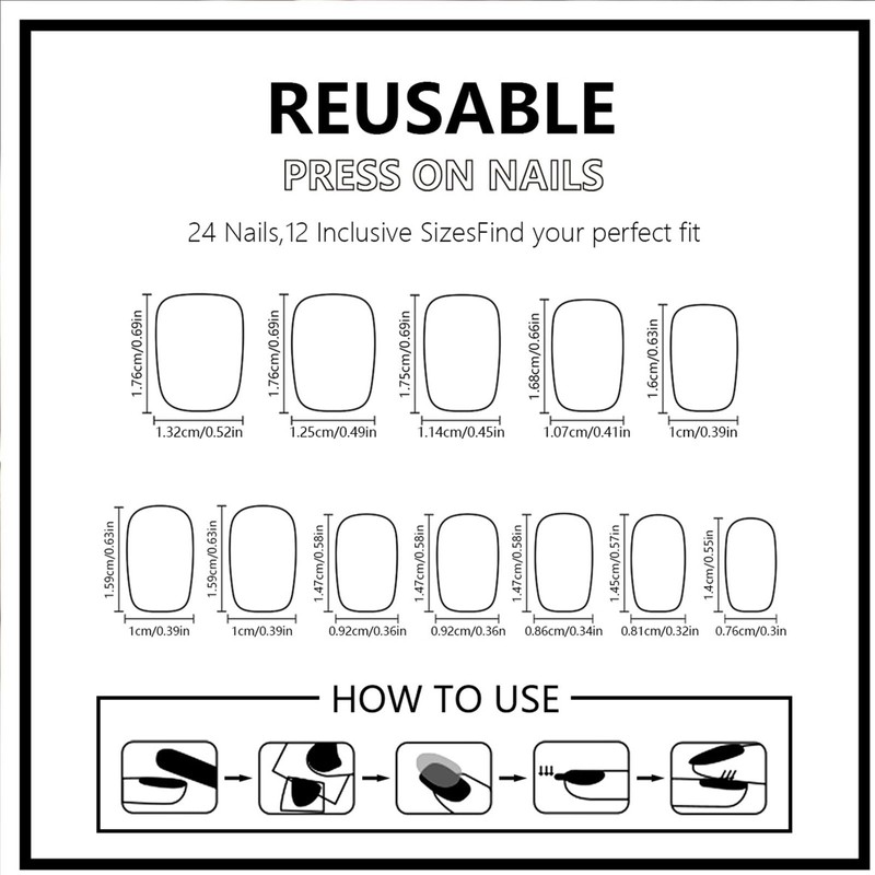 - Package includes:24 pcs short square press on nails, 24 pcs jelly glue stickers, 1 nail file, 1 wooden stick, 1 alcohol pad, the fake nails are available in 12 different sizes, so it is convenient for you to choose the one that fits your nails