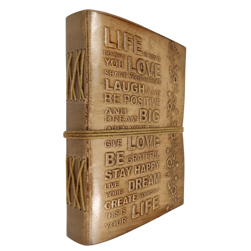 - Ledereinband geprägt mit Lebensmottos, wie z. B. Dream Big, Stay Happy, Laugh A Lot, Be Grateful und viele andere