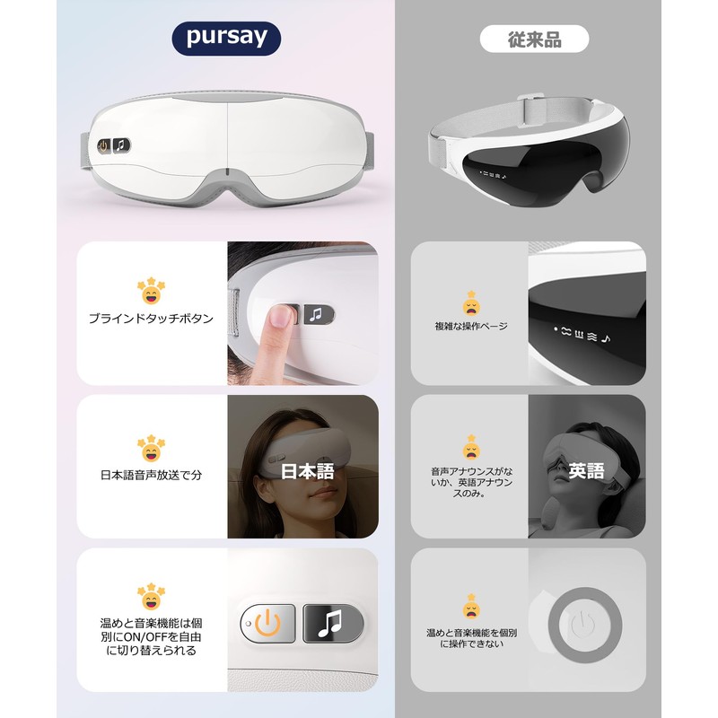 - (A Breath for a Busy Day) The Pursay eye warmer features air pressure and heating for eye care. Gently release eye fatigue. The 3D air cushion is supervised by an ophthalmologist, and gently adheres to the face, providing the ultimate eye care due to air pressure and hot heat. Comfortable like professional care Comfortable like professional care With 2 adjustable pressure modes, you can easily feel the beauty in the office or at home. Treat yourself to a day hard work