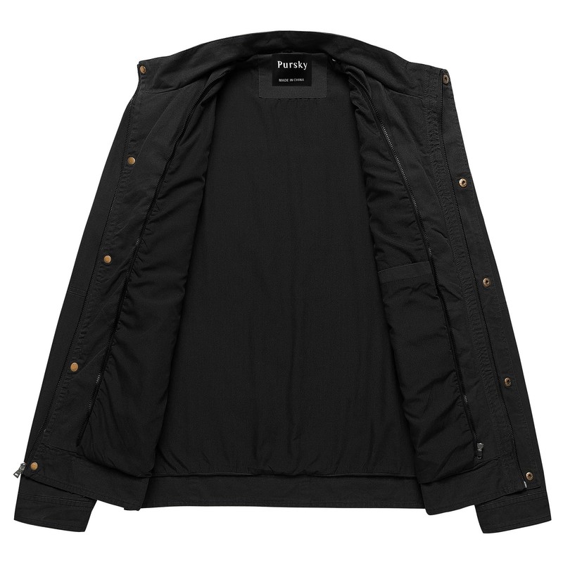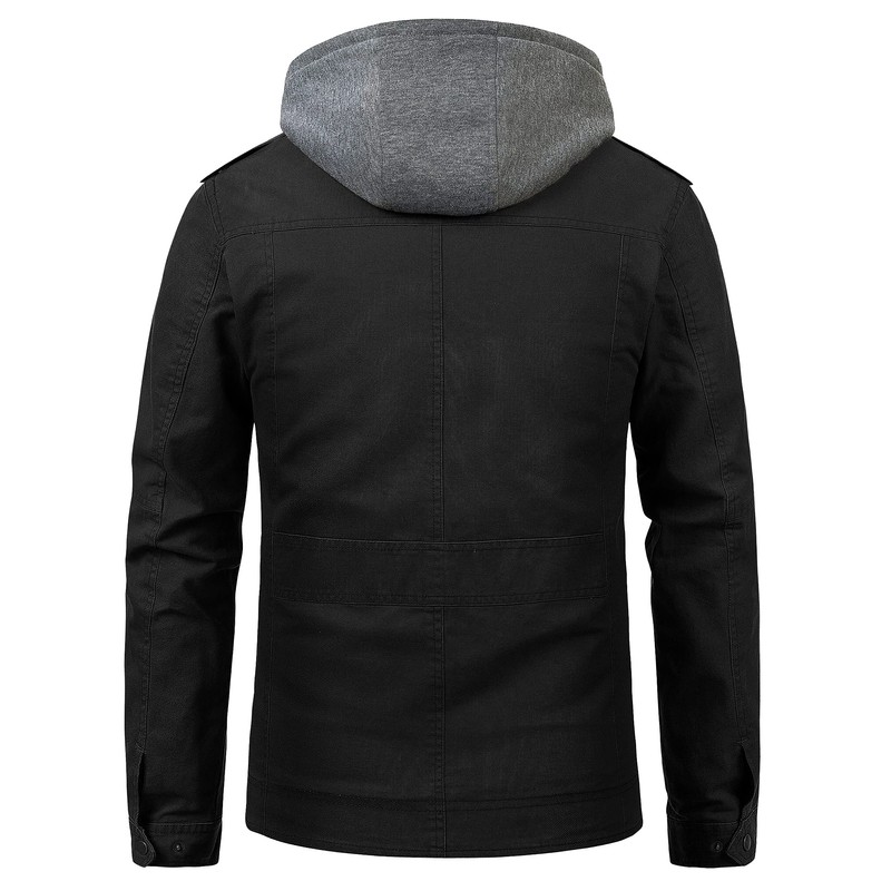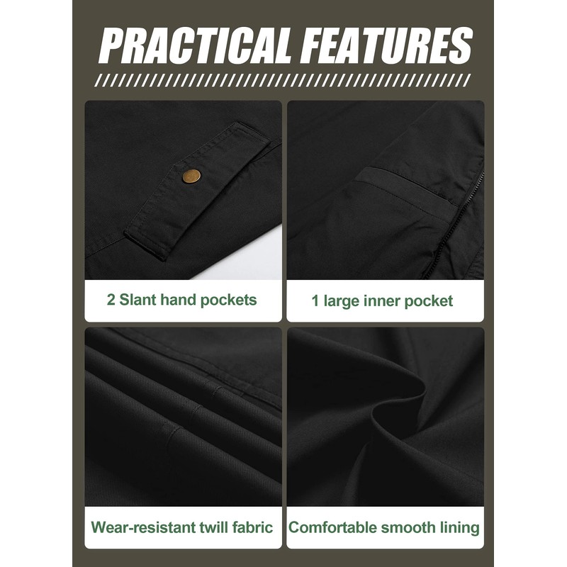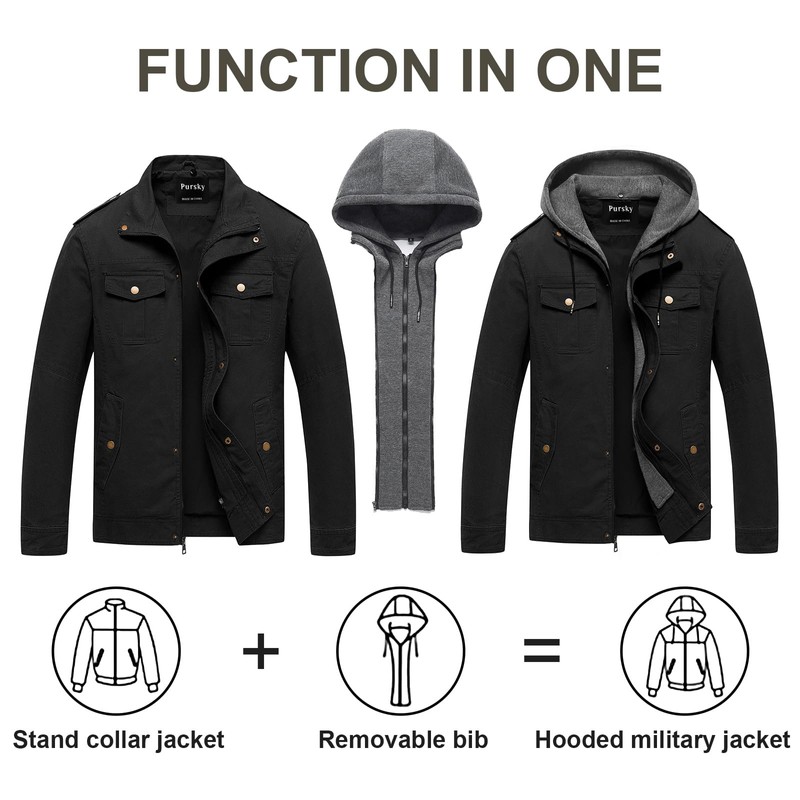 - 👉Practical Features of Canvas Jacket: 5 Pockets design (2 on the chest pockets,2 that are under flaps on top of the hand pockets,1 interior pocket) Full zipper stand collar hooded jacket use firmer metal zipper and button,enclosure as well as button enclosures can better protect you from wind and cold temperatures.( The hoodie part is removable)adjustable snap cuffs,This adds comfort and military style