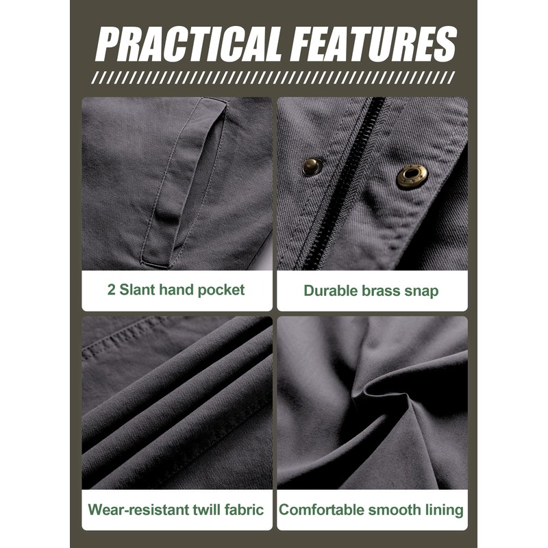 - 👉Functionality: 6 Pockets design(1 welt zipper pocket above left chest pocket,2 chest flap pockets with snaps,2 slant hand pockets and 1 large interior pocket offer enough capacity for securing essentials)Full zipper Lapel hooded jacket use firmer metal zipper and button,enclosure as well as button enclosures can better protect you from wind and cold temperatures.Adjustable snap cuffs added comfort and military style.Closure with smooth zipper&snap front placket