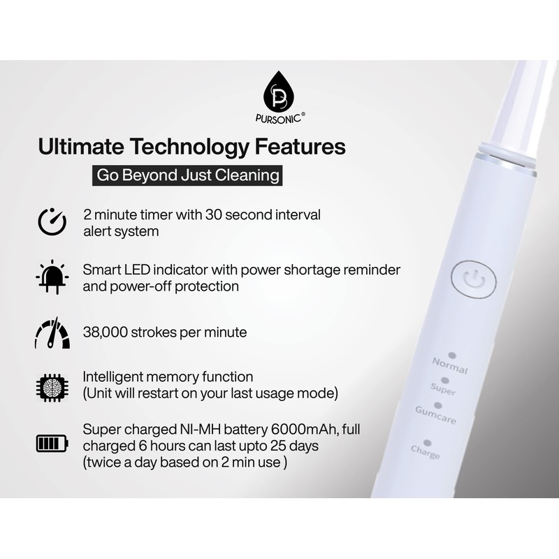 - 3 BRUSHING MODES- Normal, Super, Gumcare. each mode offers various oral care needs.