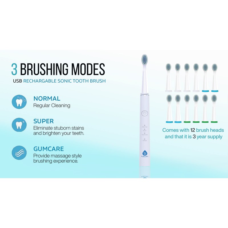 Pursonic Whitening USB Rechargeable Sonic Toothbrush-12 Brush Heads!- 38,000 Brush Strokes Per Minute-3 Brushing Modes with 2 Minute Auto Timer (White)