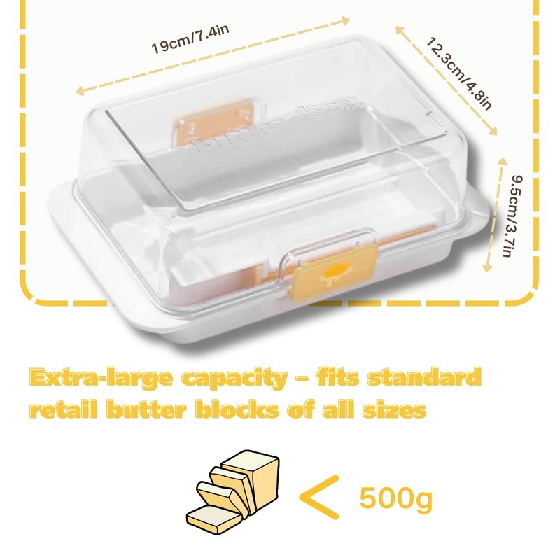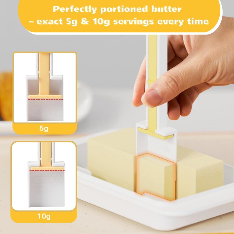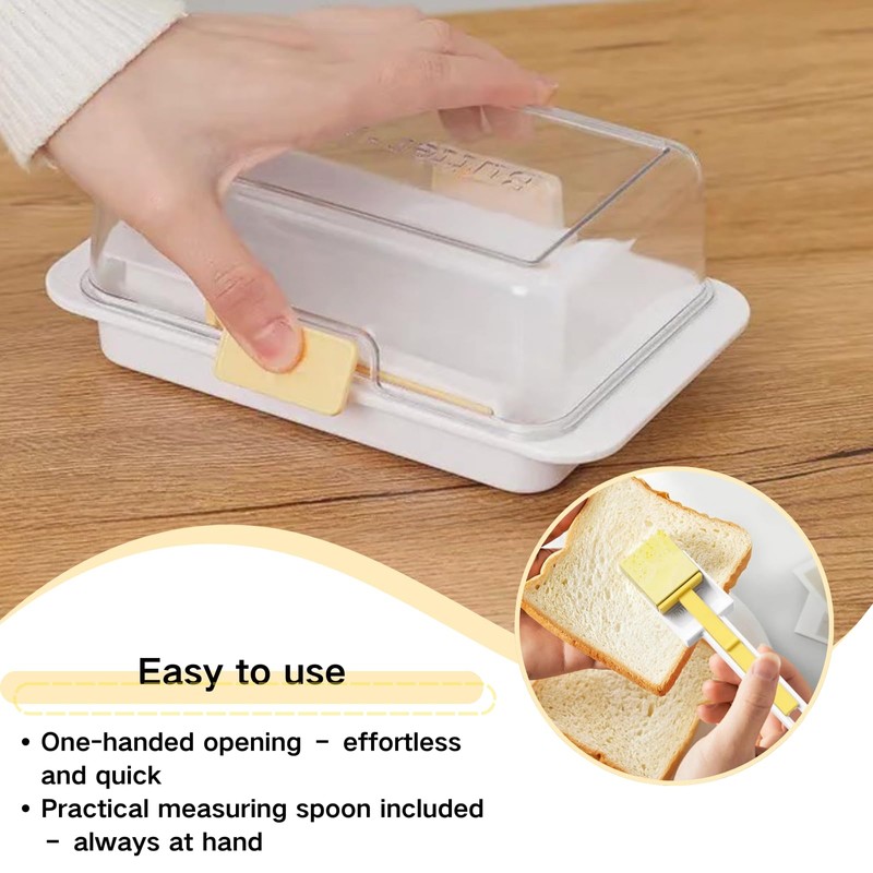 - Butter Container with Innovative Adjustable Multi-Function Measuring Spoon: Slide the spoon handle to measure precise 5g or 10g portions of butter – perfect for spreading on toast as a practical butter dish. After use, the measuring spoon can be stored space-efficiently on the butter box/butter dome (never lose it again!) and remains always within reach.