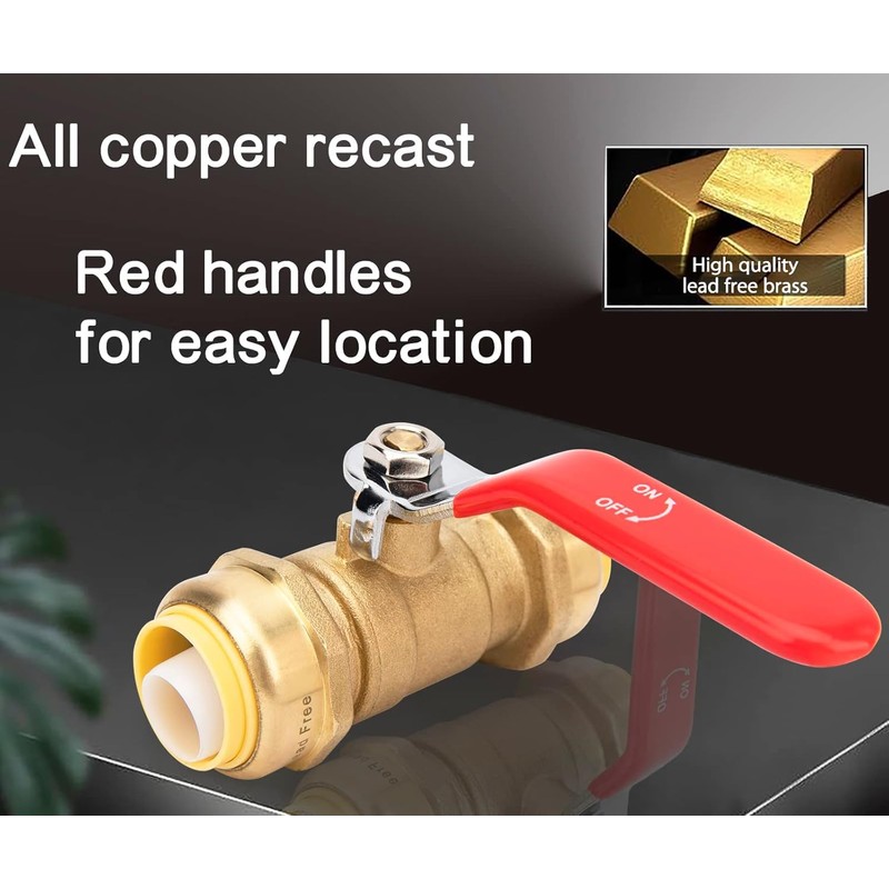 - Durable Push Fit Ball Valve: Crafted with premium lead-free brass, this 3/4 Inch water shut off valve resists corrosion, handles extreme temps (up to 200°F), and withstands 200 PSI pressure. Built to last without cracking or leaking, it’s safe for drinking water—perfect for health-conscious families! The bold red handle ensures instant visibility, so you’ll never fumble in emergencies