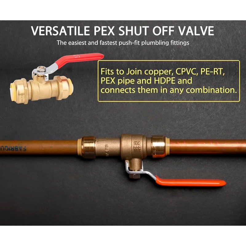 - Universal Push-Fit Full Port Ball Valve: 3/4 Inch ball valve works seamlessly with copper, CPVC, PEX, PE-RT, HDPE pipes—mix and match materials! Perfect for hot/cold water systems, potable water lines, hydronic heating, and whole-house filtration. Use indoors, outdoors, or behind walls with confidence