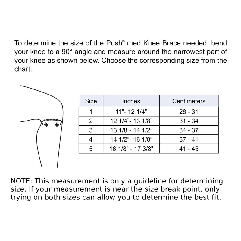 The Push med knee support provides the knee joint with extensive support in the medial and lateral direction. The knee gets stabilising support thanks to two leaf spring hinges that uniquely follow the natural rotational movement of the knee. Flexion and extension of the knee are not hindered. The band construction ensures tight fit of the leaf spring hinges on the knee joint.