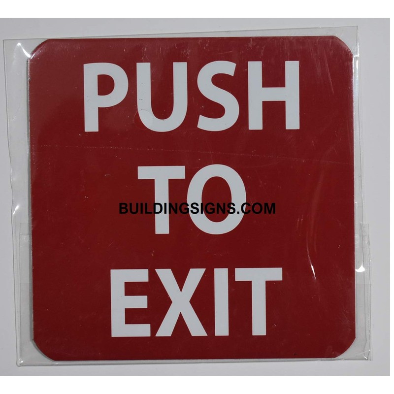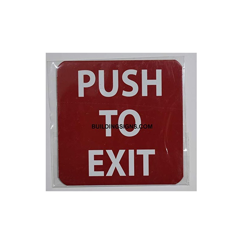 PUSH TO EXIT SIGN - BRUSH RED BACKGROUND (ALUMINIUM - 4x4) WITH SELF ADHESIVE STICKER FOR INDOOR USE. The thickness of the sign is 0.5MM. The self adhesive sticker is RED with very strong adhesive force. The sign is made from ALUMINUM and is exceptionally sturdy. The sign is for indoor use only.