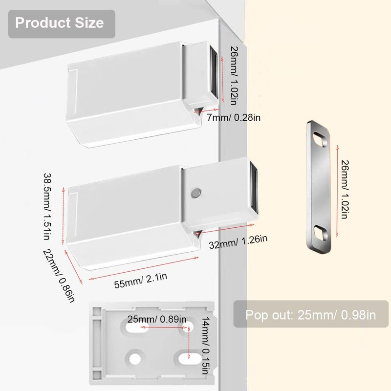 - Powerful Magnetic Closure: Long stroke with built-in a larger magnet ensures a secure close point that makes the door more tightly united and says goodbye to 'drifting open' doors. The magnetic force can reach 25 pounds, adapted to different door sizes. It also works on invisible doors up to 275 lbs. Can be used in a cabinet, drawer, cupboard, wardrobe, chipboard, sideboard, cooking utensils, and hidden/ invisible door