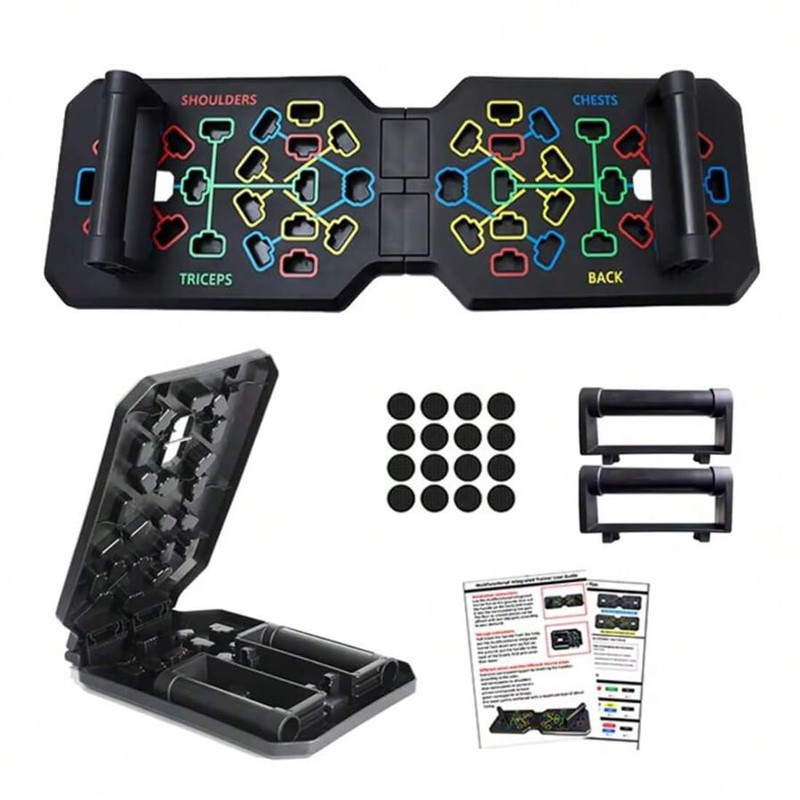 Transform your push-up routine with this innovative 19-in-1 push-up board system. The color-coded board features clearly marked target zones for shoulders, chest, triceps, and back muscles, helping you achieve precise form and maximize your workout effectiveness. This foldable design makes it perfect for both home gyms and travel use. The sturdy push-up handles provide comfortable grip and proper wrist alignment during exercises. Included resistance bands add versatility to your workout, allowing you to increase difficulty and engage additional muscle groups. The comprehensive package includes the main board, handles, resistance bands, and non-slip pads for stability. The included exercise guide helps you make the most of the multiple positions and combinations available. Built with durable materials, this push-up system helps you perform exercises with proper form while targeting specific muscle groups. Whether you're a beginner or advanced fitness enthusiast, this versatile piece of equipment offers numerous exercise variations to help you achieve your strength training goals.