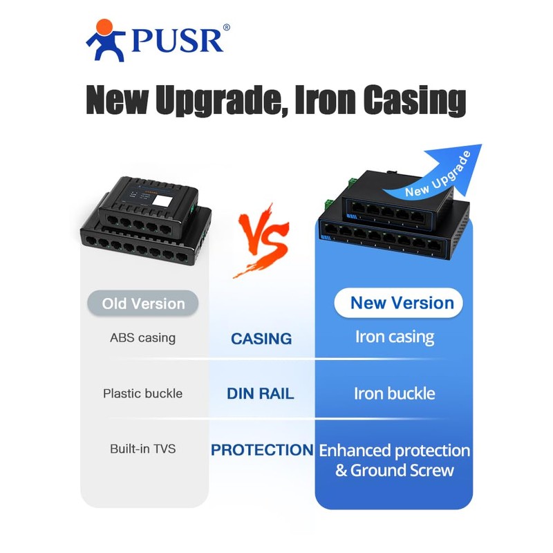PUSR 5 Ports 100M Ethernet Network Switch DC or Terminal Power Supply Plug and Play Supports Auto MDI/MDIX DIN Rail Installation and Desktop Placement Iron Housing USR-SF1005